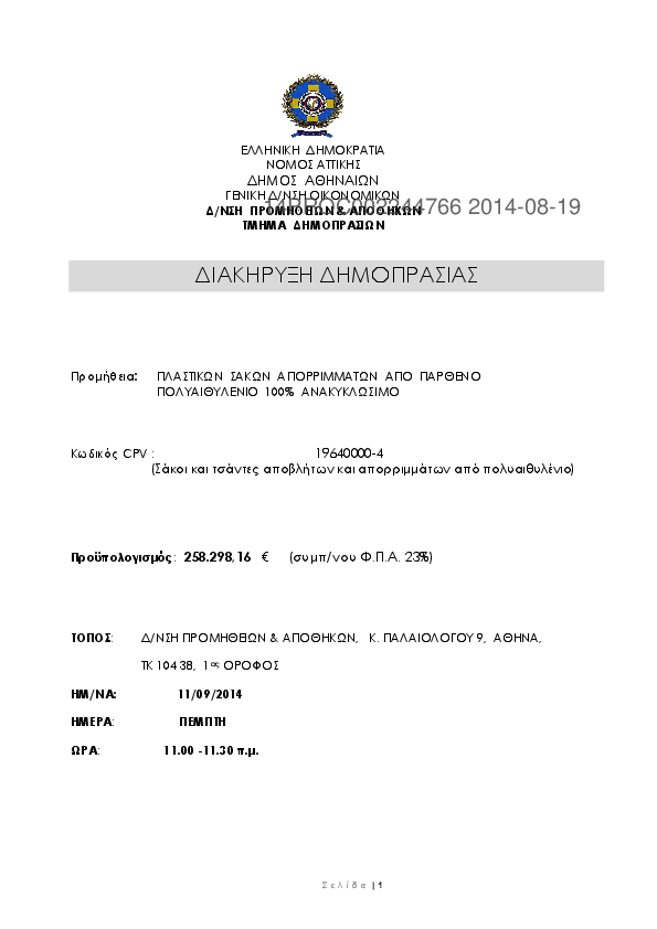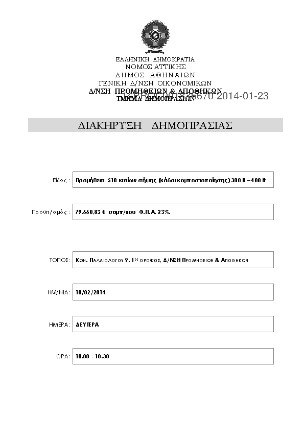 1. ΤΑΚΤΙΚΟΣ ΕΠΑΝΑΛΗΠΤΙΚΟΣ ΔΙΑΓΩΝΙΣΜΟΣ ΠΡΟΜΗΘΕΙΑΣ 510 ΚΥΤΙΩΝ ΣΗΨΗΣ 300