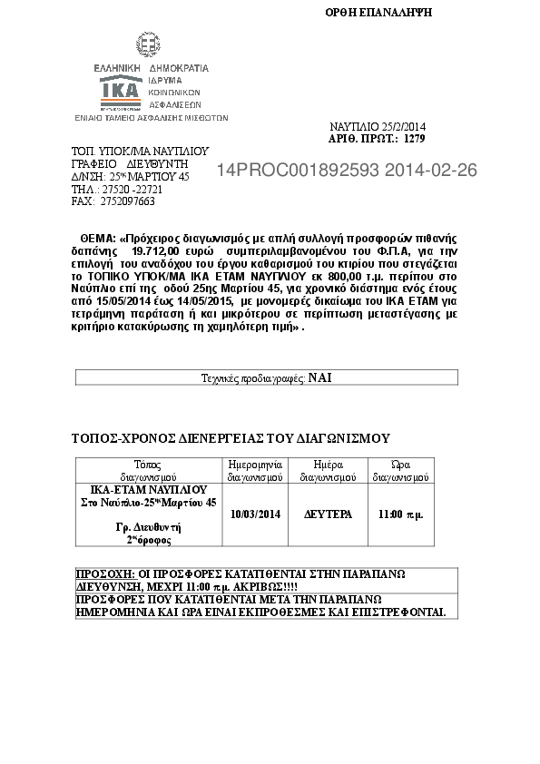7. ΠΡΟΚΥΡΗΞΗ ΠΡΟΧΕΙΡΟΥ ΔΙΑΓΩΝΙΣΜΟΥ ΜΕ ΑΠΛΗ ΣΥΛΛΟΓΗ ΠΡΟΣΦΟΡΩΝ ΠΙΘΑΝΗΣ ΔΑΠΑΝΗΣ 19.712,00 ΕΥΡΩ ΓΙΑ ΤΗΝ ΕΠΙΛΟΓΗ ΤΟΥ ΑΝΑΔΟΧΟΥ ΤΟΥ ΕΡΓΟΥ ΚΑΘΑΡΙΣΜΟΥ ΤΟΥ ΚΤΙΡΙΟΥ ΣΤΕΓΑΣΗΣ ΤΟΥ ΤΟΠΙΚΟΥ ΥΠΟΚ/ΤΟΣ ΙΚΑ ΕΤΑΜ ΝΑΥΠΛΙΟΥ