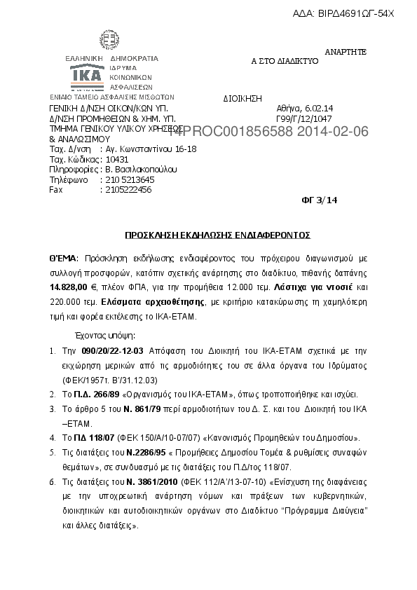 5. ΔΗΜΟΣΙΟΣ ΑΝΟΙΚΤΟΣ ΔΙΑΓΩΝΙΣΜΟΣ ΜΕ ΑΝΤΙΚΕΙΜΕΝΟ: «ΠΑΡΟΧΗ ΤΑΧΥΔΡΟΜΙΚΩΝ ΥΠΗΡΕΣΙΩΝ ΣΤΟ ΙΚΑ