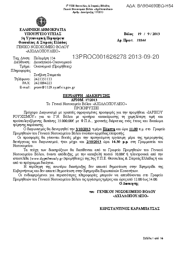 5. ΠΕΡΙΛΗΨΗ ΚΑΙ ΔΙΑΚΗΡΥΞΗ ΑΡΙΘΜΟΣ 19/2013 ΓΙΑ ΤΗΝ ΠΡΟΜΗΘΕΙΑ ΘΕΡΜΟΓΡΑΦΙΚΟΥ ΧΑΡΤΙΟΥ ΓΙΑ ΤΟ ΓΝ ΒΟΛΟΥ