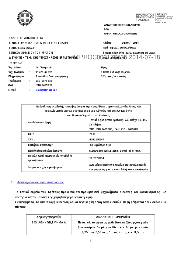 2. ΔΙΑΚΗΡΥΞΗ ΑΝΟΙΧΤΟΥ ΔΗΜΟΣΙΟΥ ΔΙΑΓΩΝΙΣΜΟΥ ΠΡΟΜΗΘΕΙΑΣ ΣΤΗΛΩΝ ΚΑΙ ΠΡΟΣΤΗΛΩΝ ΔΙΑΦΟΡΩΝ ΧΡΩΜΑΤΟΓΡΑΦΩΝ ΩΣ ΚΑΙ ΓΡΑΦΙΤΩΝ ΓΙΑ ΤΙΣ ΑΝΑΓΚΕΣ ΤΟΥ ΓΕΝΙΚΟΥ ΧΗΜΕΙΟΥ ΤΟΥ ΚΡΑΤΟΥΣ