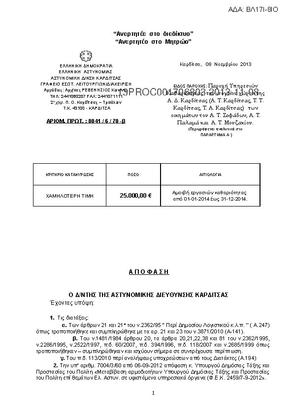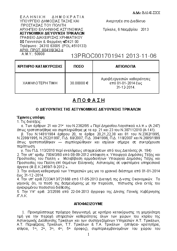 8. Διακήρυξη πρόχειρου διαγωνισμού καθαριότητας κτιρίων στέγασης υπηρεσιών Α.Δ.Καρδίτσας για το έτος 2014.