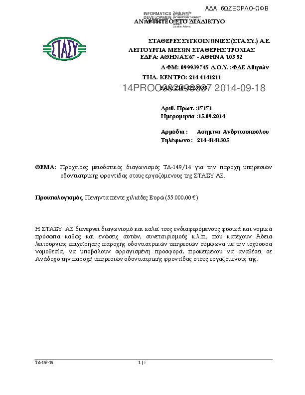 1. Διενέργεια πρόχειρου μειοδοτικού διαγωνισμού ΤΔ-149/14 για την παροχή υπηρεσιών οδοντιατρικής φροντί