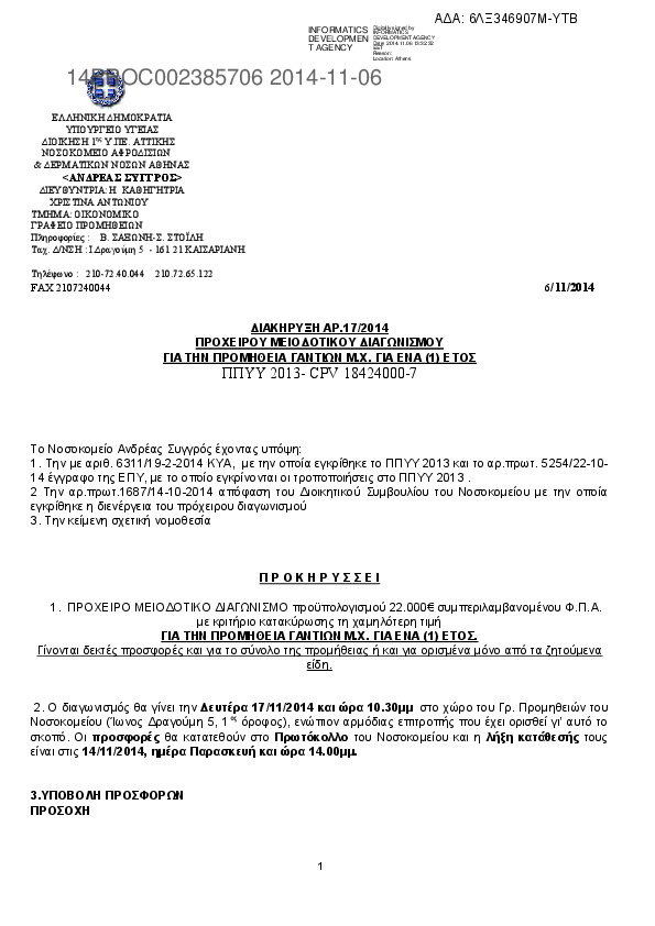 1. ΠΡΟΜΗΘΕΙΑ ΓΑΝΤΙΩΝ Μ.Χ. ΓΙΑ ΕΝΑ ΕΤΟΣ