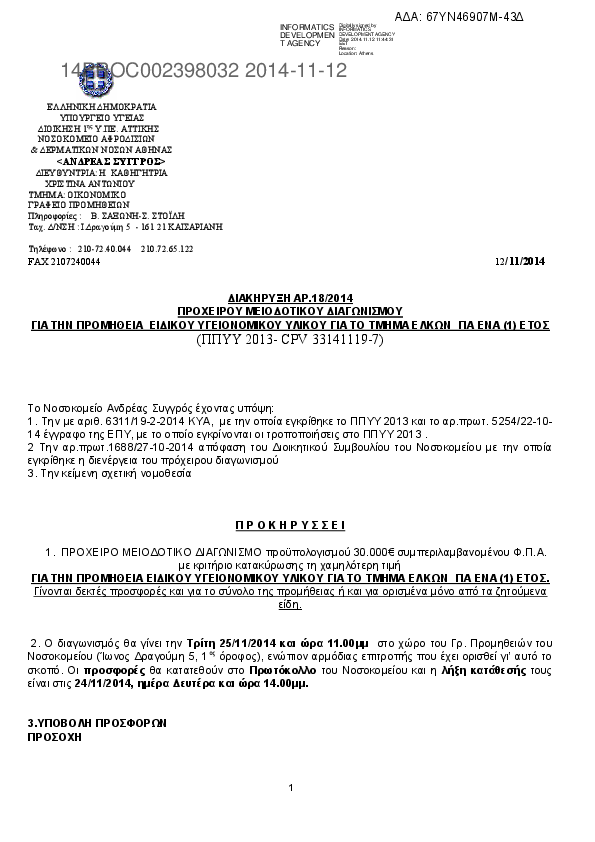 2. ΔΙΑΚΗΡΥΞΗ ΑΡ.18/2014 ΠΡΟΧΕΙΡΟΥ ΜΕΙΟΔΟΤΙΚΟΥ ΔΙΑΓΩΝΙΣΜΟΥ ΓΙΑ ΤΗΝ ΠΡΟΜΗΘΕΙΑ ΕΙΔΙΚΟΥ ΥΓΕΙΟΝΟΜΙΚΟΥ ΥΛΙΚΟΥ