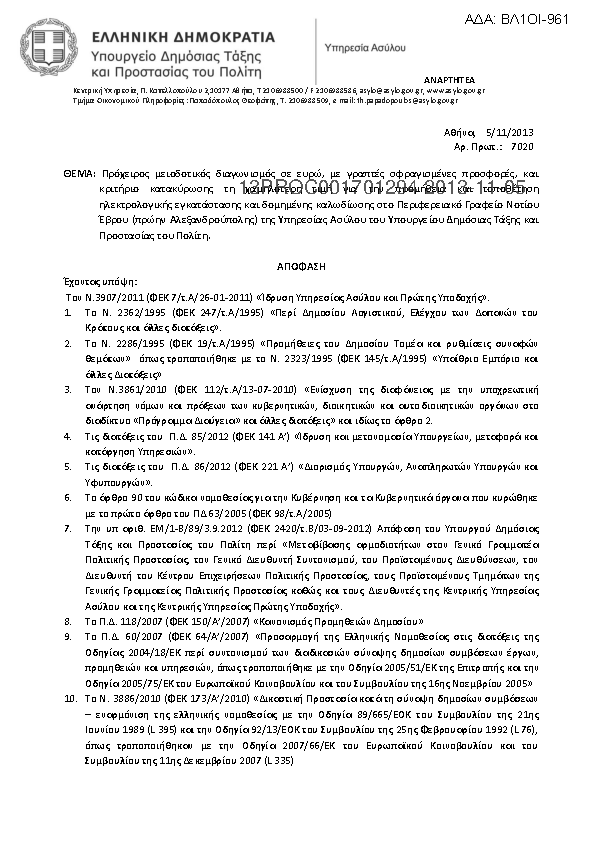 7. Πρόχειρος μειοδοτικός διαγωνισμός σε ευρώ, με γραπτές σφραγισμένες προσφορές, και κριτήριο κατακύρωσης τη χαμηλότερη τιμή για την παροχή υπηρεσιών φύλαξης – ασφάλειας των εγκαταστάσεων της Κεντρικής Υπηρεσίας Ασύλου, της Αρχής Προσφυγών ...