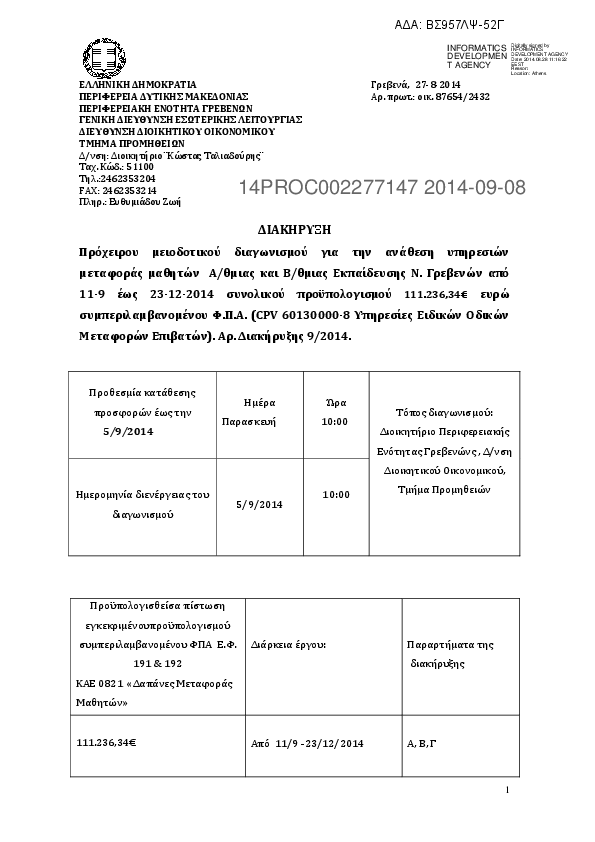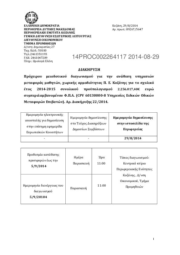 6. ΠΡΟΚΗΡΥΞΗ ΠΡΟΧΕΙΡΟΥ ΔΙΑΓΩΝΙΣΜΟΥ ΜΕΤΑΦΟΡΑΣ ΜΑΘΗΤΩΝ Π.Ε ΚΟΖΑΝΗΣ ΓΙΑ ΤΟ ΣΧΟΛΙΚΟ ΕΤΟΣ 2014-2015