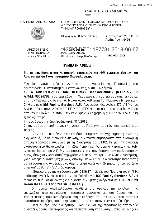 9. Σύναψη σύμβασης μεταξύ του ΑΠΘ και της Εταιρείας ISS Security S.A για την φύλαξη κτιρίων ΑΠΘ