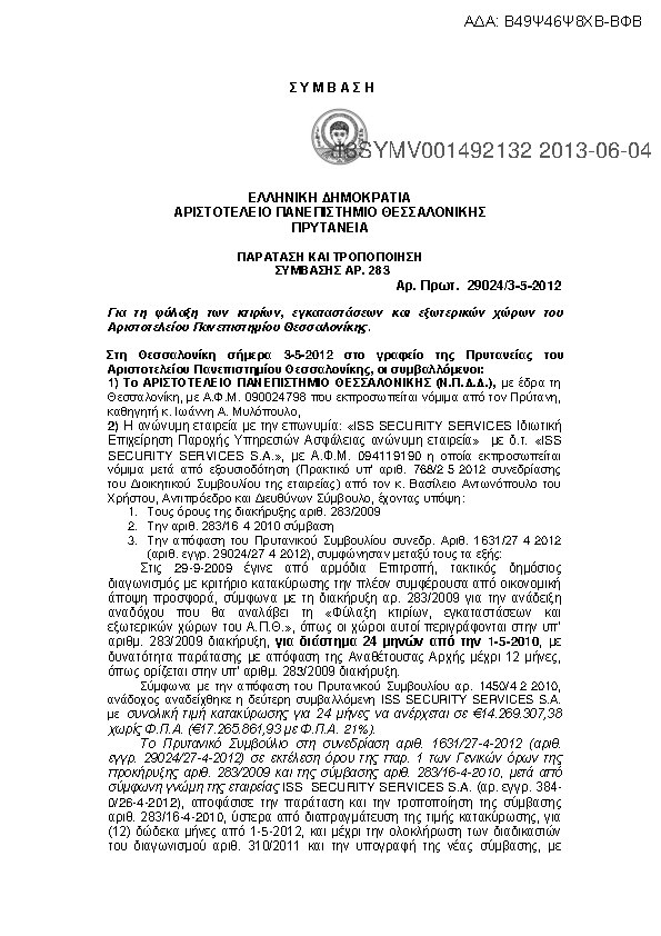 10. Σύναψη σύμβασης μεταξύ του ΑΠΘ και της Εταιρείας ISS Security S.A για την φύλαξη κτιρίων ΑΠΘ
