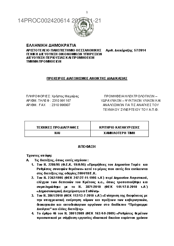 1. ροκήρυξη διεθνούς διαγωνισμού για την προμήθεια ξενόγλωσσων περιοδικών (εντύπων και ηλεκτρονικών) για τις ανάγκες του Α.Π.Θ.