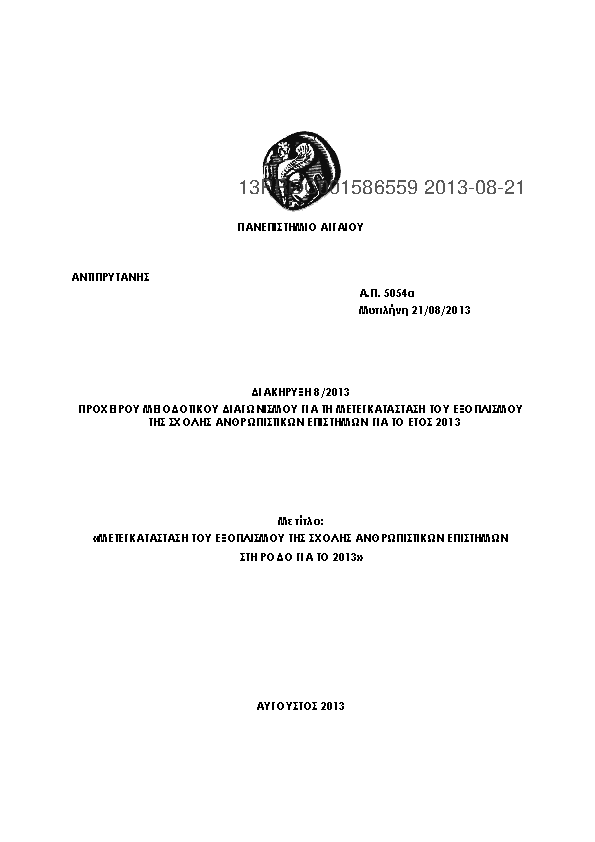 3. ΠΕΡΙΛΗΨΗ ΔΙΑΚΗΡΥΞΗΣ ΠΡΟΧΕΙΡΟΥ ΜΕΙΟΔΟΤΙΚΟΥ ΔΙΑΓΩΝΙΣΜΟΥ ΓΙΑ ΤΗ ΜΕΤΕΓΚΑΤΑΣΤΑΣΗ ΤΟΥ ΕΞΟΠΛΙΣΜΟΥ ΤΗΣ ΣΧΟΛΗΣ ΑΝΘΡΩΠΙΣΤΙΚΩΝΕΠΙΣΤΗΜΩΝ ΓΙΑ ΤΟ ΕΤΟΣ 2013