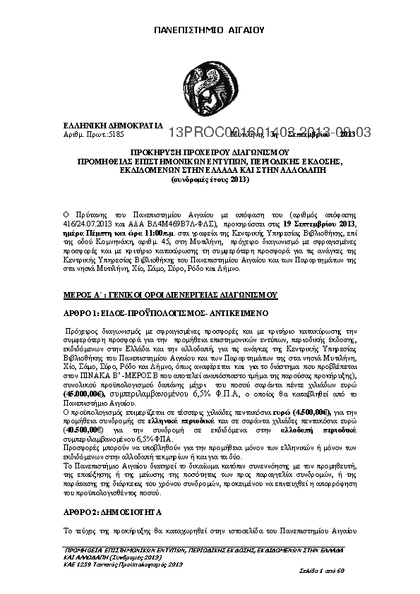 1. ΑΠΟΦΑΣΗ ΠΡΥΤΑΝΗ 416(2013) ΘΕΜΑ ΠΡΟΚΥΡΥΞΗ ΠΡΟΧΕΙΡΟΥ ΔΙΑΓΩΝΙΣΜΟΥ ΓΙΑ ΤΗΝ ΠΡΟΜΗΘΕΙΑ ΕΠΙΣΤΗΜΟΝΙΚΩΝ ΠΕΡΙΟΔΙΚΩΝ ΠΟΥ ΕΚΔΙΔΟΝΤΑΙ ΣΤΗΝ ΕΛΛΑΔΑ ΚΑΙ ΤΗΝ ΑΛΛΟΔΑΠΗ.