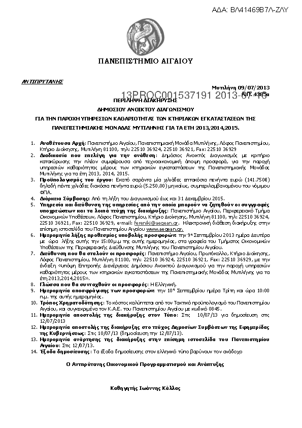 4. ΠΕΡΙΛΗΨΗ ΔΙΑΚΗΡΥΞΗΣΔΗΜΟΣΙΟΥ ΑΝΟΙΚΤΟΥ ΔΙΑΓΩΝΙΣΜΟΥΓΙΑ ΤΗΝ ΠΑΡΟΧΗ ΥΠΗΡΕΣΙΩΝ ΚΑΘΑΡΙΟΤΗΤΑΣ ΤΩΝ ΚΤΗΡΙΑΚΩΝ ΕΓΚΑΤΑΣΤΑΣΕΩΝ ΤΗΣ ΠΑΝΕΠΙΣΤΗΜΙΑΚΗΣ ΜΟΝΑΔΑΣ ΜΥΤΙΛΗΝΗΣ ΓΙΑ ΤΑ ΕΤΗ 2013,2014,2015.
