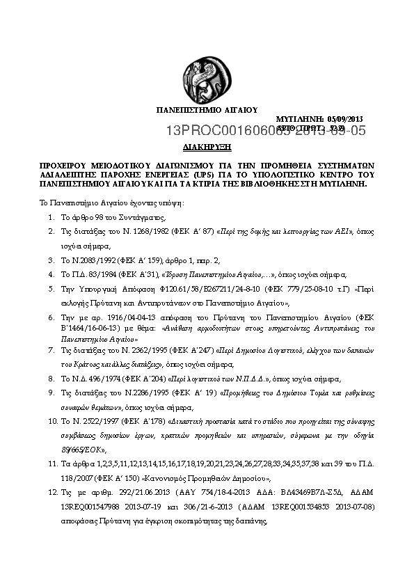 2. Προκήρυξη πρόχειρου μειοδοτικού διαγωνισμού για την προμήθεια συστημάτων αδιάλειπτης παροχής ενέργειας (UPS), στο υπολογιστικό κέντρο του Πανεπιστημίου Αιγαίου και στα κτήρια της Βιβλιοθήκης στη Μυτιλήνη.