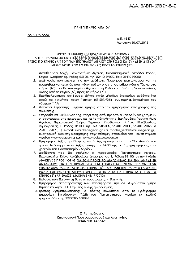 5. ΠΕΡΙΛΗΨΗ ΔΙΑΚΗΡΥΞΗΣ ΠΡΟΧΕΙΡΟΥ ΔΙΑΓΩΝΙΣΜΟΥ ΓΙΑ ΤΗΝ ΠΡΟΜΗΘΕΙΑ ΚΑΙ ΕΓΚΑΤΑΣΤΑΣΗ ΝΕΩΝ ΠΕΔΙΩΝ ΣΤΟΝ ΥΠΟΣΤΑΘΜΟ ΜΕΣΗΣΤΑΣΗΣ ΣΤΟ ΚΤΗΡΙΟ (Α΄) ΤΟΥ ΠΑΝΕΠΙΣΤΗΜΙΟΥ ΑΙΓΑΙΟΥ ΣΤΗ ΡΟΔΟ ΚΑΙ ΣΥΝΔΕΣΗ ΔΙΚΤΥΟΥ ΜΕΣΗΣ ΤΑΣΗΣ ΑΠΟ ΤΟ ΚΤΗΡΙΟ (Α΄) ΠΡΟΣ ΤΟ ΚΤΗΡΙΟ (Β΄)