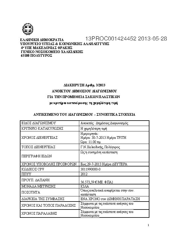 8. Διακήρυξη δημόσιου ανοικτού διαγωνισμού για την προμήθεια σάκων πλαστικών