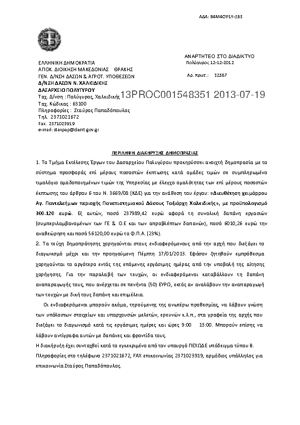 1. Δημοσίευση περίληψηε Διακήρυξης δημοπρασίας για το έργο "Συμπληρωματική διευθέτηση τμήματος κοίτης Δυτικού Χειμάρρου Σταυρού"