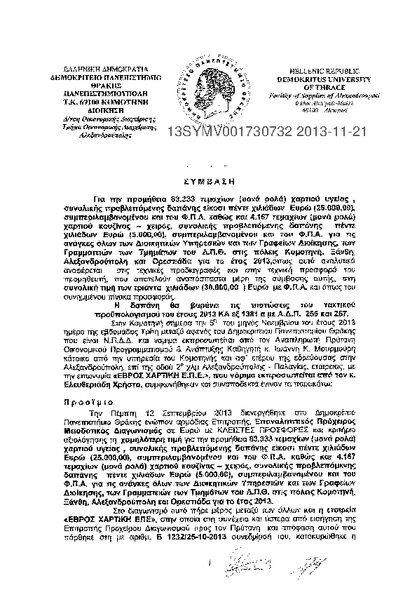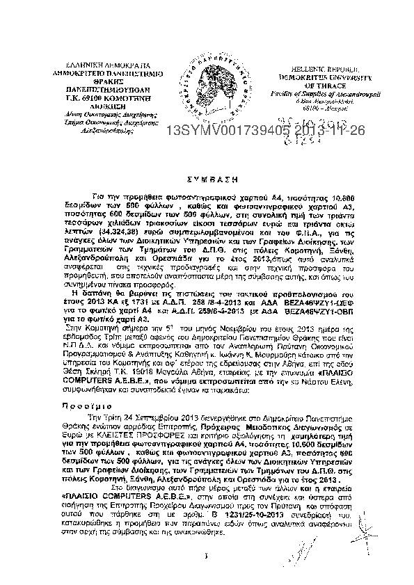3. Σύμβαση για την προμήθεια φωτοαντιγραφικού χαρτιού Α4 και Α3 για τις ανάγκες του Δ.Π.Θ.