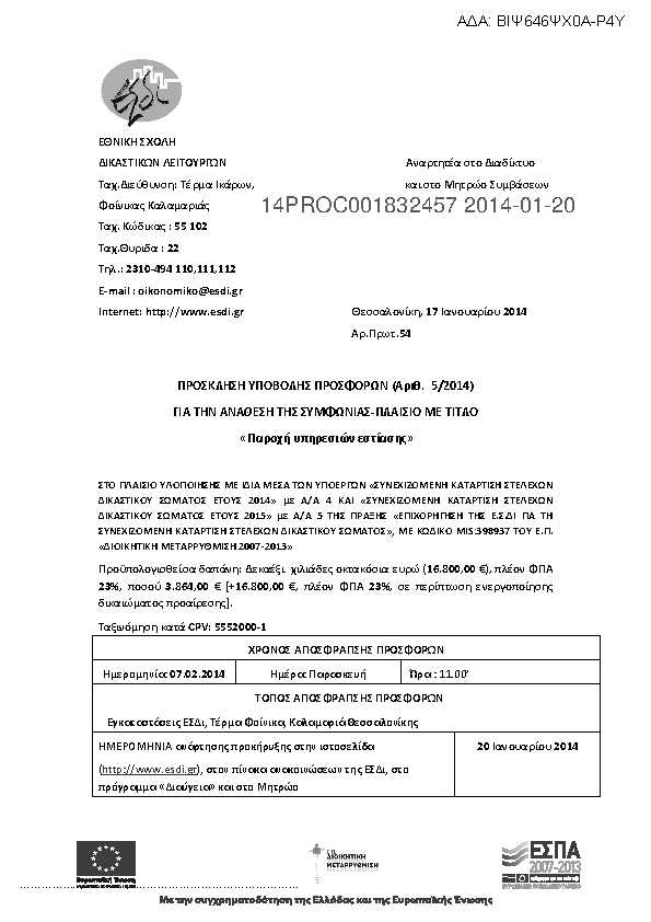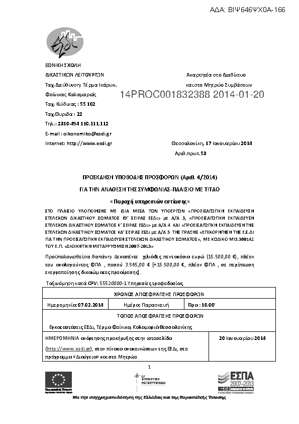 5. Προκήρυξη διενέργειας πρόχειρου διαγωνισμού με αντικείμενο την παροχή υπηρεσιών εστίασης στους, εν γένει, συμμετέχοντες σε προγράμματα συνεχιζόμενης κατάρτισης της ΕΣΔι εντός του έτους 2014 (και 2015 σε περίπτωση ενεργοποίησης του δικαιώ...