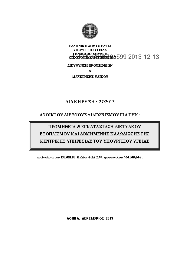 7. Διενέργεια ανοικτού διεθνούς μειοδοτικού διαγωνισμού για την προμήθεια & εγκατάσταση δικτυακού εξοπλισμού και δομημένης καλωδίωσης της κεντρικής υπηρεσίας του Υπουργείου Υγείας.
