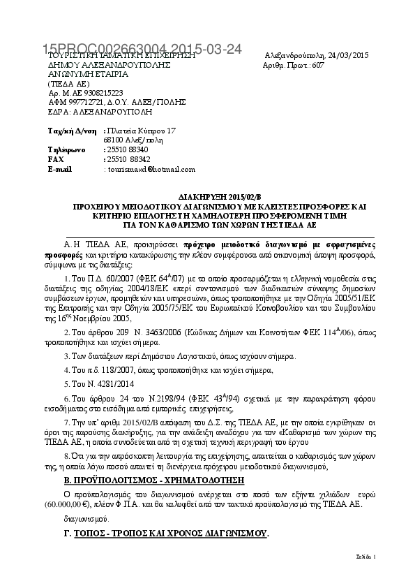 1. Διακήρυξη Εργασίας «Ναυαγοσωστικής κάλυψης ακτών Δήμου Κατερίνης» (αριθ. μελέτης 6/2015)
