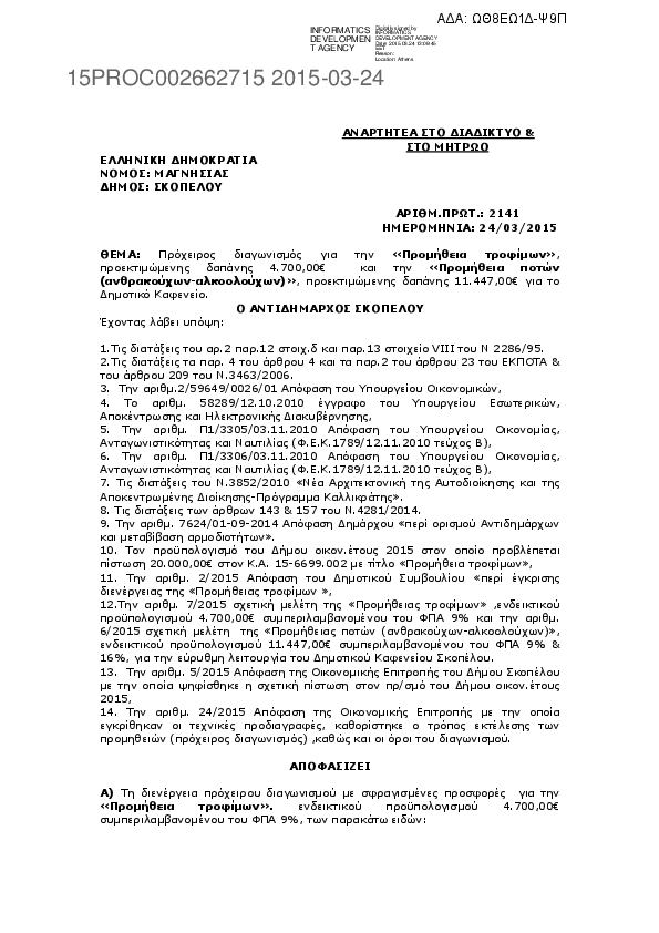 9. ΑΠΟΦΑΣΗ ΑΝΤΙΔΗΜΑΡΧΟΥ ΔΙΕΝΕΡΓΕΙΑΣ ΠΡΟΧΕΙΡΟΥ ΔΙΑΓΩΝΙΣΜΟΥ ΠΡΟΜΗΘΕΙΑΣ ΤΡΟΦΙΜΩΝ ΚΑΙ ΠΟΤΩΝ ΤΟΥ ΔΗΜΟΤΙΚΟΥ ΚΑΦΕΝΕΙΟΥ
