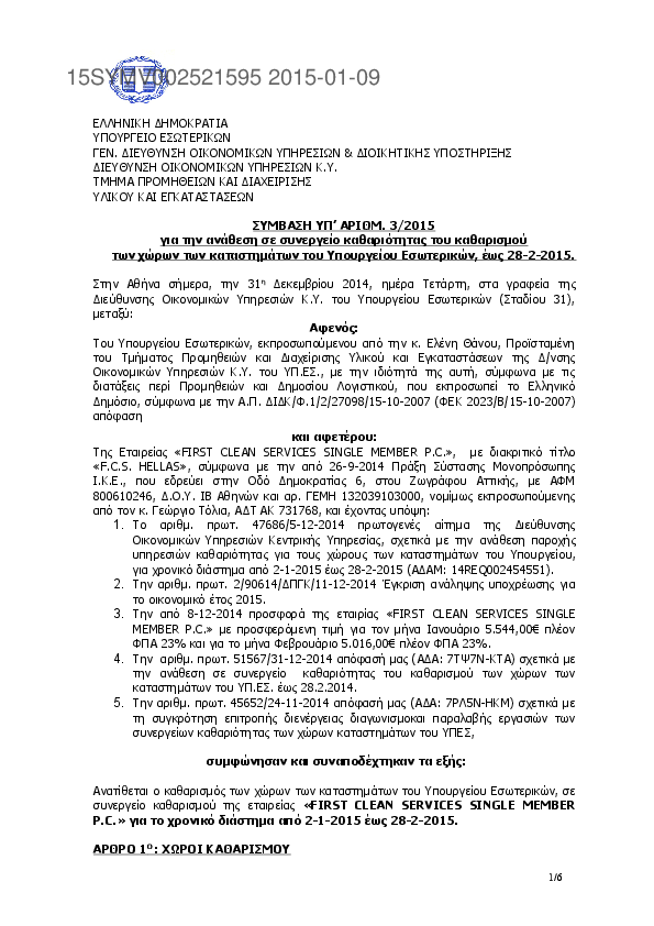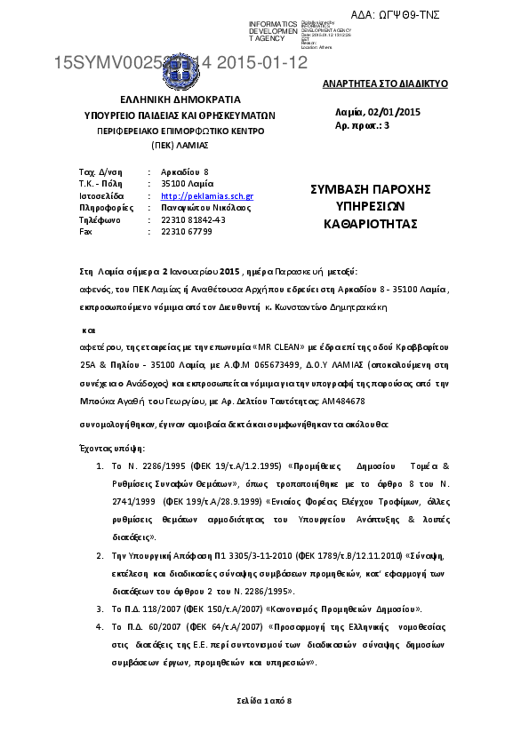 8. ΣΥΜΒΑΣΗ Νο.3/2015 ΓΙΑ ΣΥΝΕΡΓΕΙΟ ΚΑΘΑΡΙΟΤΗΤΑΣ ΤΩΝ ΧΩΡΩΝ ΤΟΥ ΥΠ.ΕΣ. ΕΩΣ 28-2-2015