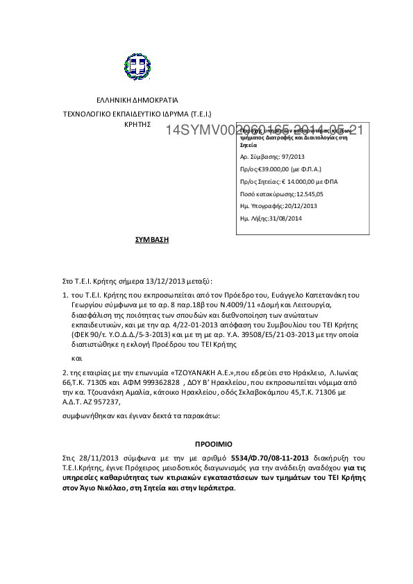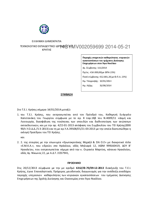 1. Σύμβαση παροχής υπηρεσιών καθαριότητας των κτιριων του ΤΕΙ Κρήτης στη Σητεία