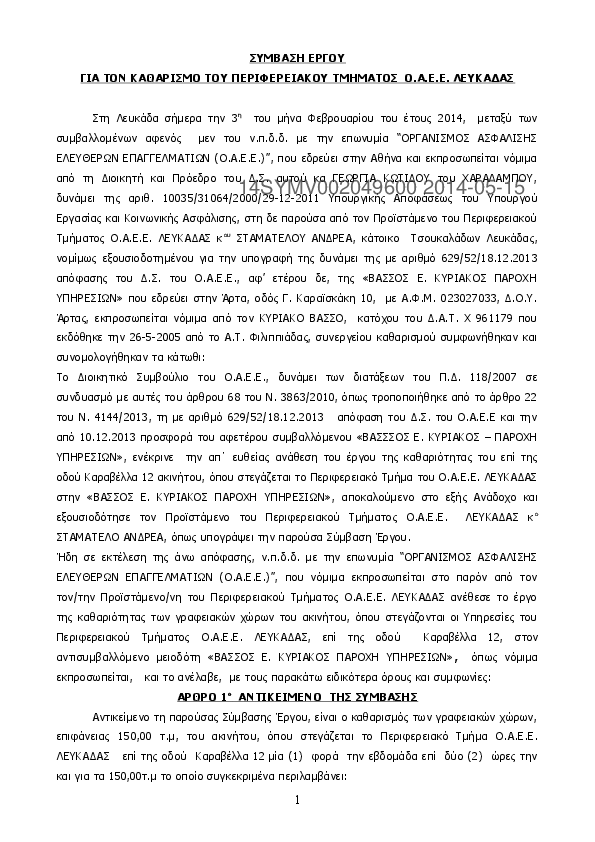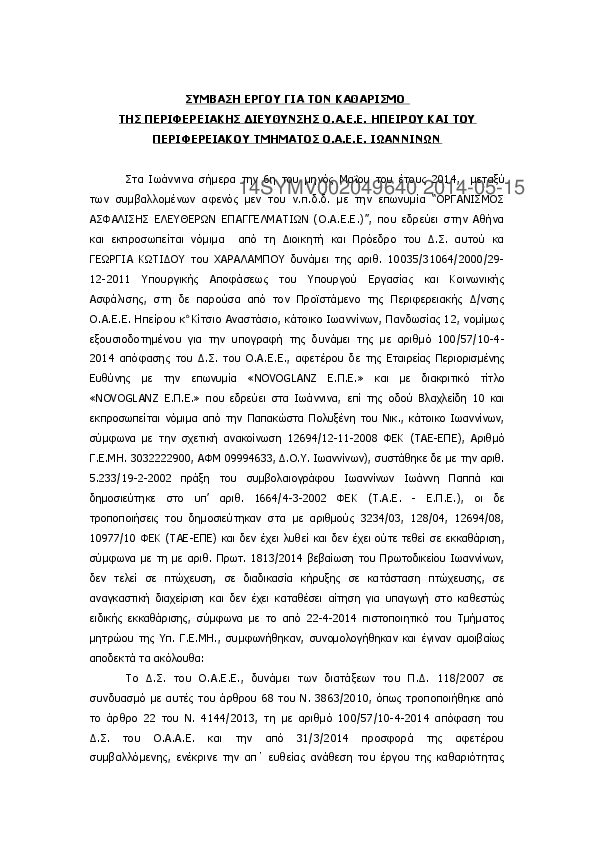 8. ΣΥΜΒΑΣΗ ΕΡΓΟΥ ΚΑΘΑΡΙΣΜΟΥ ΤΗΣ ΠΕΡΙΦ/ΚΗΣ Δ/ΝΣΗΣ Ο.Α.Ε.Ε. ΗΠΕΙΡΟΥ ΚΑΙ ΤΟΥ ΠΕΡΙΦ/ΚΟΥ ΤΜ. ΟΑΕΕ ΙΩΑΝΝΙΝΩΝ