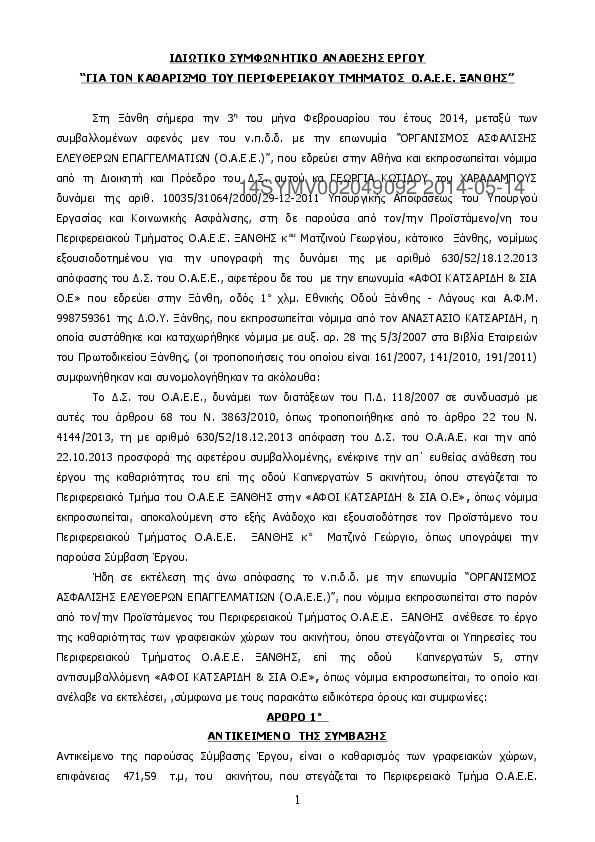 7. ΙΔΙΩΤΙΚΟ ΣΥΜΦΩΝΗΤΙΚΟ ΑΝΑΘΕΣΗΣ ΕΡΓΟΥ ΓΙΑ ΤΟΝ ΚΑΘΑΡΙΣΜΟ ΤΟΥ ΠΕΡΙΦΕΡΕΙΑΚΟΥ ΤΜΗΜΑΤΟΣ Ο.Α.Ε.Ε. ΞΑΝΘΗΣ