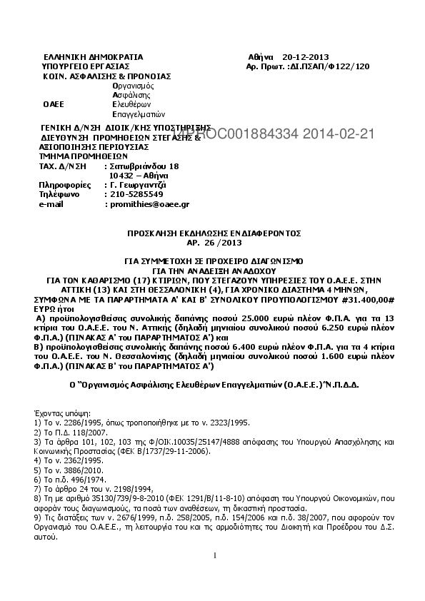 3. ΠΡΟΣΚΛΗΣΗ ΕΚΔΗΛΩΣΗΣ ΕΝΔΙΑΦΕΡΟΝΤΟΣ ΑΡ. 26/2013 ΓΙΑ ΤΟΝ ΚΑΘΑΡΙΣΜΟ ΚΤΙΡΙΩΝ