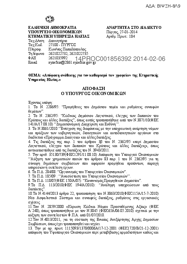 5. ΑΚΥΡΩΜΕΝΗ - ΑΠΟΦΑΣΗ ΑΝΑΘΕΣΗΣ ΓΙΑ ΤΟΝ ΚΑΘΟΡΙΣΜΟ ΤΩΝ ΓΡΑΦΕΙΩΝ ΤΗΣ ΚΤΗΜΑΤΙΚΗΣ ΥΠΗΡΕΣΙΑΣ ΗΛΕΙΑΣ