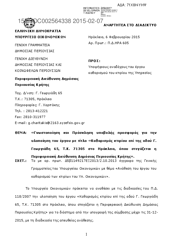 10. Γνωστοποίηση και Πρόσκληση υποβολής προσφοράς για την υλοποίηση του έργου με τίτλο «Καθαρισμός κτιρίου επί της οδού Γ. Γεωργιάδη 65, Τ.Κ. 71305 στο Ηράκλειο, όπου στεγάζεται η Περιφερειακή Διεύθυνση Δημόσιας Περιουσίας Κρήτης