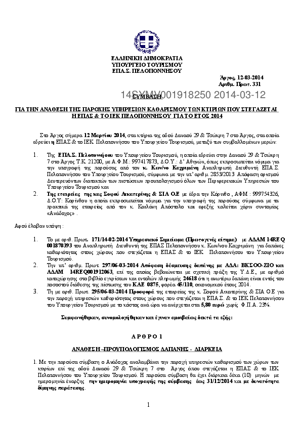 1. Σύμβαση για την εκτέλεση εργασιών καθαρισμού των εγκαταστάσεων της ΕΠΑΣ