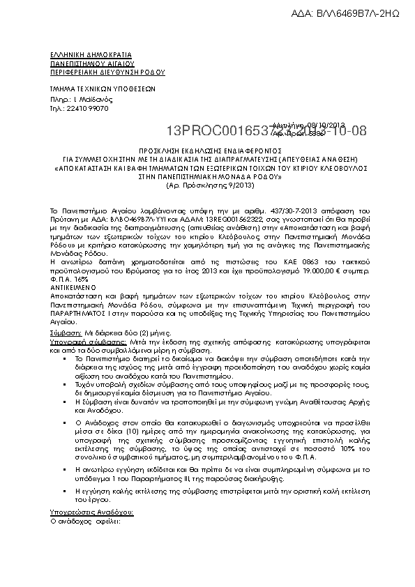 9. ΠΡΟΣΚΛΗΣΗ ΕΚΔΗΛΩΣΗΣ ΕΝΔΙΑΦΕΡΟΝΤΟΣ ΓΙΑ ΣΥΜΜΕΤΟΧΗ ΣΤΗΝ ΜΕ ΤΗ ΔΙΑΔΙΚΑΣΙΑ ΤΗΣ ΔΙΑΠΡΑΓΜΑΤΕΥΣΗΣ (ΑΠΕΥΘΕΙΑΣ ΑΝΑΘΕΣΗ) «ΑΠΟΚΑΤΑΣΤΑΣΗ ΚΑΙ ΒΑΦΗ ΤΜΗΜΑΤΩΝ ΤΩΝ ΕΞΩΤΕΡΙΚΩΝ ΤΟΙΧΩΝ ΤΟΥ ΚΤΙΡΙΟΥ ΚΛΕΟΒΟΥΛΟΣ ΣΤΗΝ ΠΑΝΕΠΙΣΤΗΜΙΑΚΗ ΜΟΝΑΔΑ ΡΟΔΟΥ»(Αρ. Πρόσκλησης 9...