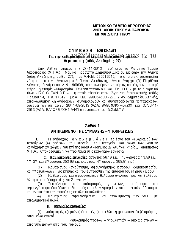 3. Σ Υ Μ Β Α Σ Η 1/2013/ΔΔΠ Για την καθαριότητα του κτιρίου Μετοχικού Ταμείου Αεροπορίας (οδός Ακαδημία
