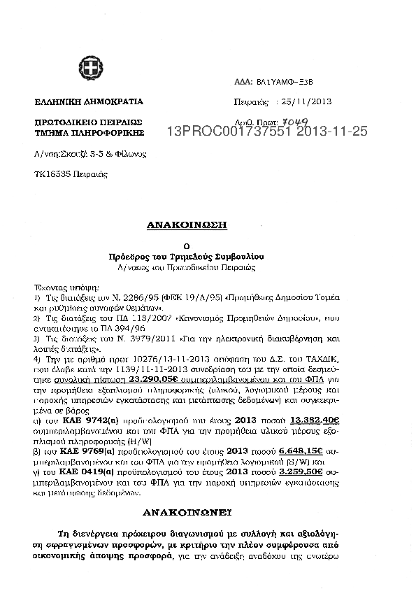 2. Διενέργεια Πρόχειρου διαγωνισμού στο Πρωτοδικείο Πειραιώς για την προμήθεια εξοπλισμού πληροφορικής