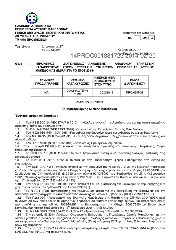 7. ΑΝΟΙΚΤΟΣ ΔΗΜΟΣΙΟΣ ΔΙΑΓΩΝΙΣΜΟΣ ΕΠΙΛΟΓΗΣ ΑΝΑΔΟΧΟΥ ΥΠΗΡΕΣΙΩΝ ΚΑΘΑΡΙΟΤΗΤΑΣ ΓΙΑ ΤΙΣ ΥΠΗΡΕΣΙΕΣ ΤΗΣ Π.Ε ΚΟΖ