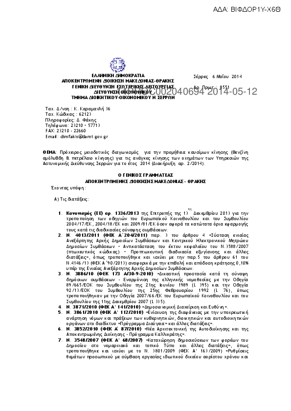 9. Πρόχειρος μειδοτικός διαγωνισμός προμήθειας υγρών καυσίμων κίνησης 2014