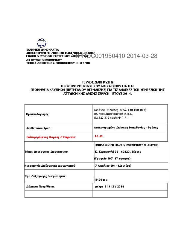 8. πρόχειρος μειοδοτικός διαγωνισμός για την προμήθεια πετρελαίου θέρμανσης