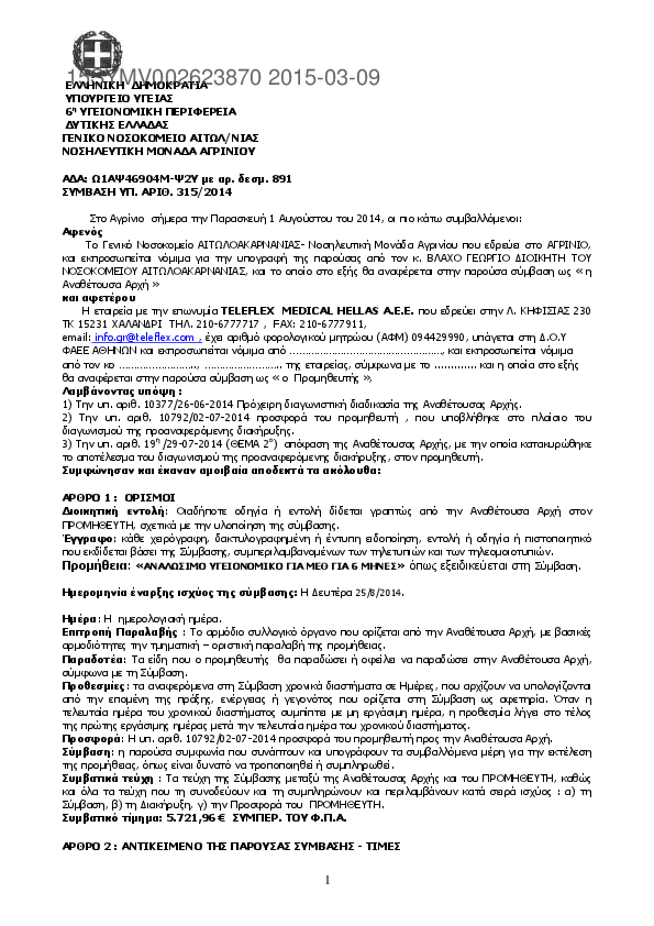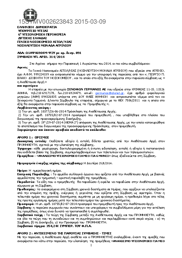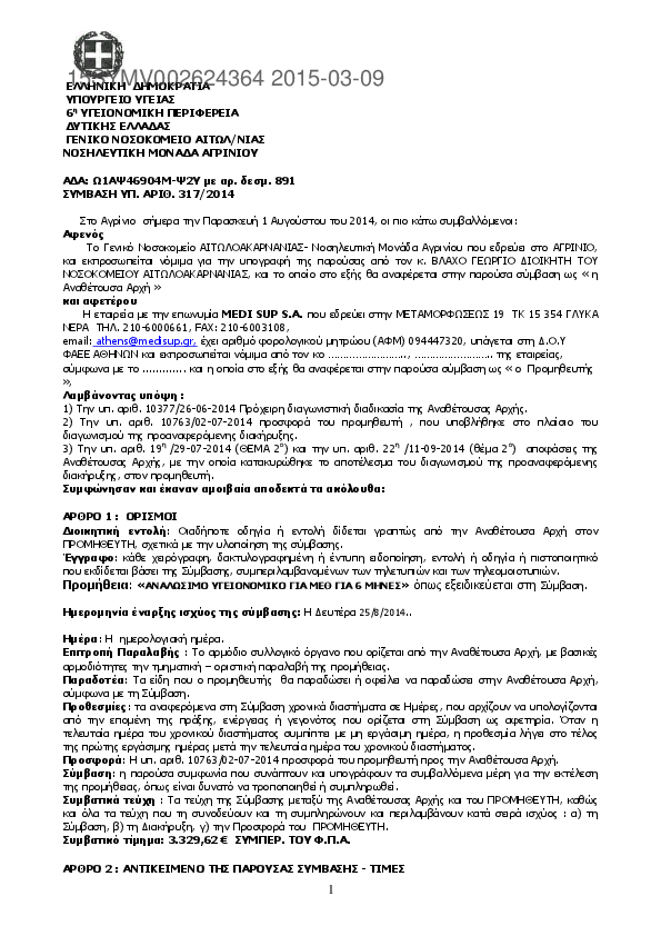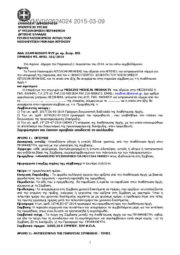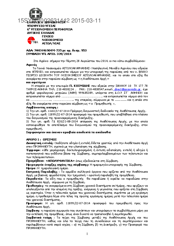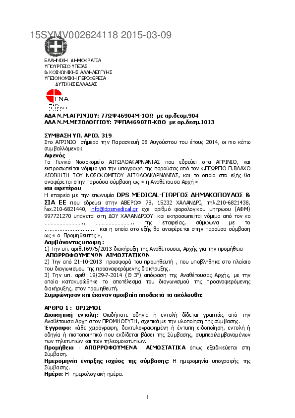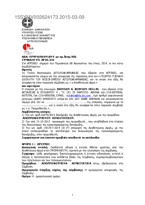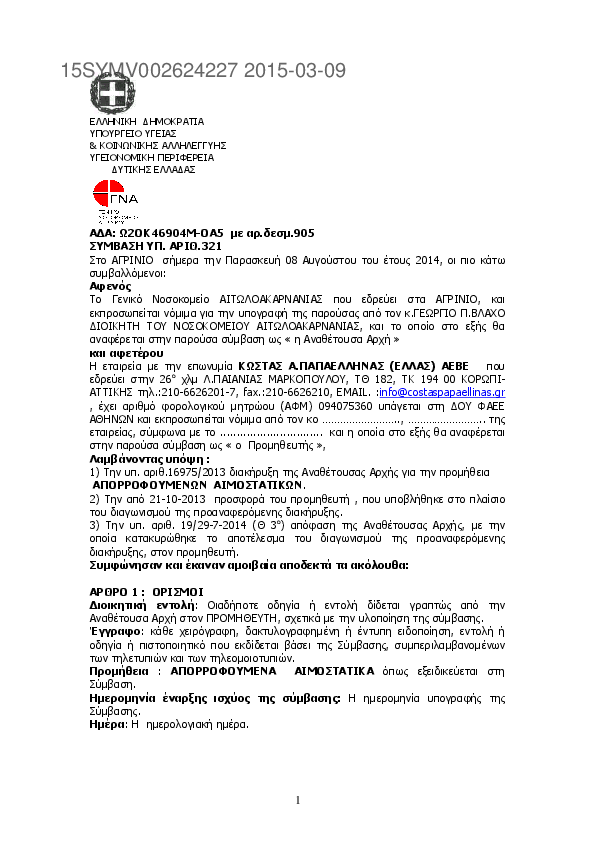 1. ΣΥΜΒΑΣΗ ΥΠ. ΑΡΙΘ.321/2014 Προμήθεια : ΑΠΟΡΡΟΦΟΥΜΕΝΑ AIMOΣΤΑΤΙΚΑ