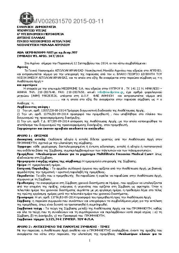 10. ΣΥΜΒΑΣΗ ΥΠ. ΑΡΙΘ. 347/2014 Προμήθεια: «Αναλωσίμων υλικών για το μηχάνημα Multifiltrate Fresenius Med