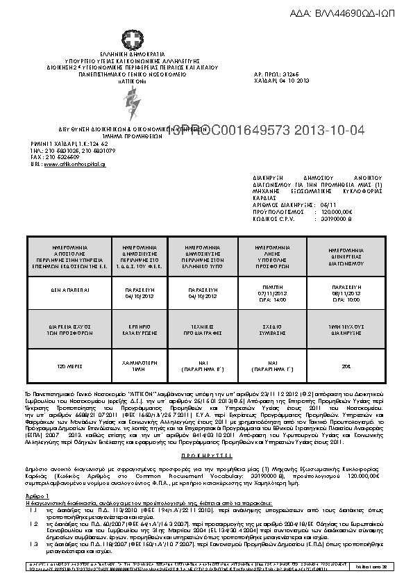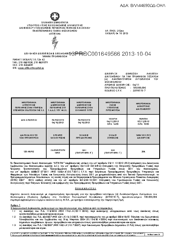 1. ΔΙΑΚΗΡΥΞΗ ΔΗΜΟΣΙΟΥ ΑΝΟΙΚΤΟΥ ΔΙΑΓΩΝΙΣΜΟΥ ΜΕ ΑΡΙΘΜΟ 05/11 ΓΙΑ ΤΗΝ ΠΡΟΜΗΘΕΙΑ ΠΡΟΜΗΘΕΙΑ ΜΙΑΣ (1) ΜΗΧΑΝΗΣ ΕΞΩΣΩΜΑΤΙΚΗΣ ΚΥΚΛΟΦΟΡΙΑΣ ΚΑΡΔΙΑΣ (ΚΩΔΙΚΟΣ ΑΡΙΘΜΟΣ ΣΤΟ COMMON PROCUREMENT VOCABULARY: 33190000