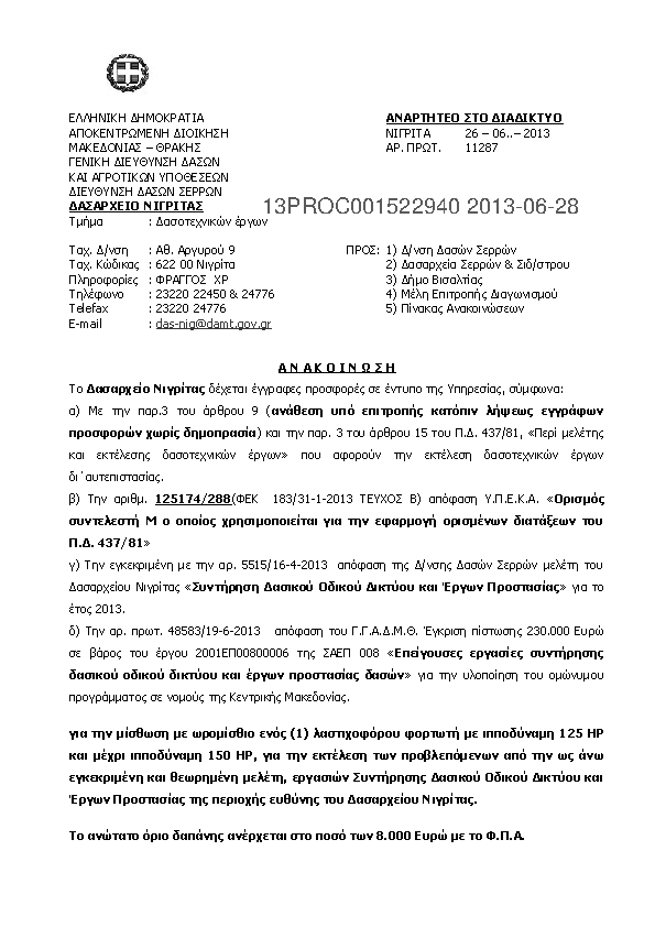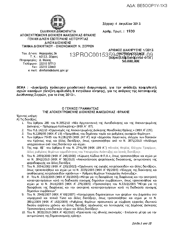 1. Διακήρυξη πρόχειρου μειοδοτικού διαγωνισμού, για την ανάδειξη προμηθευτή υγρών καυσίμων (βενζίνη αμόλυβδη & πετρέλαιο κίνησης), για τις ανάγκες της Αστυνομικής Διεύθυνσης Σερρών, για το έτος 2013