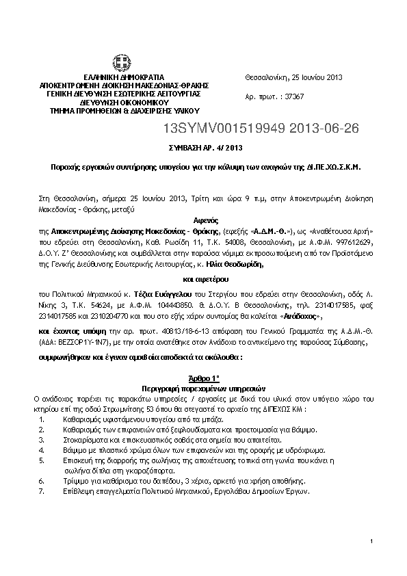 10. Σύμβαση αρ. 4/ 2013 Παροχής εργασιών συντήρησης υπογείου για τη ΔΙΠΕΧΩΣΚΜ