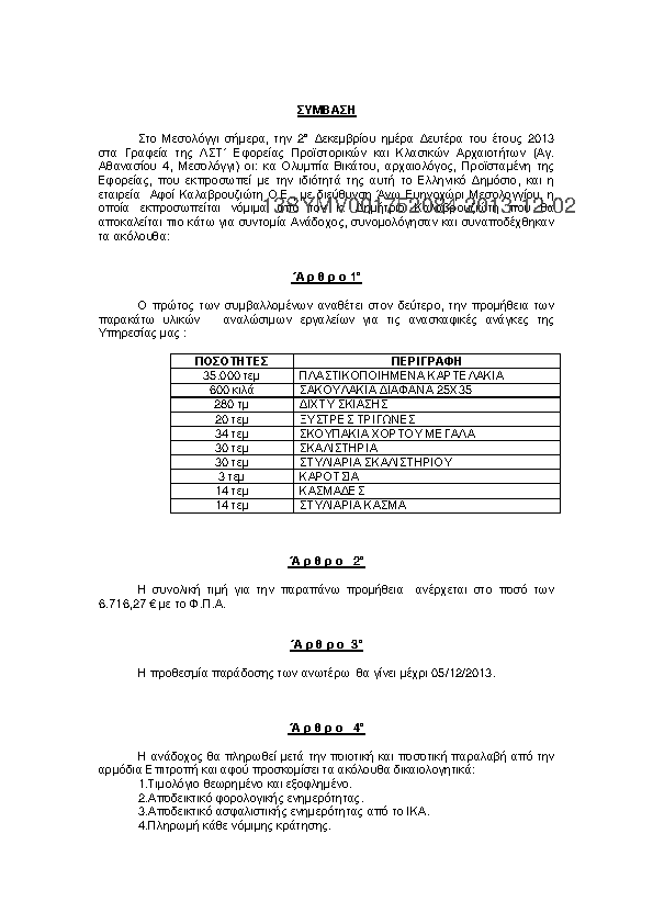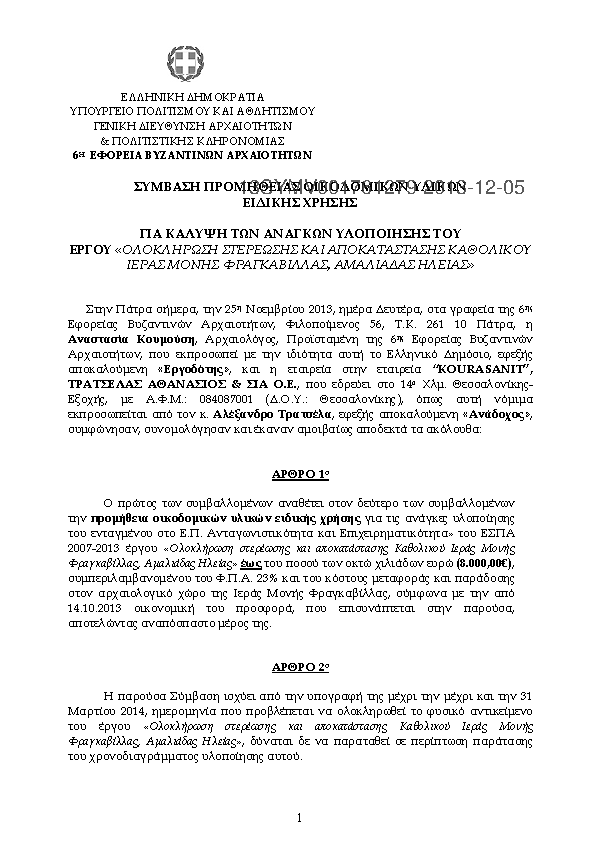 10. Σύμβαση προμήθειας οικοδομικών υλικών για το έργο"Ολοκλήρωση και αποκατάσταση Ι.Μ.Φραγκαβίλλας