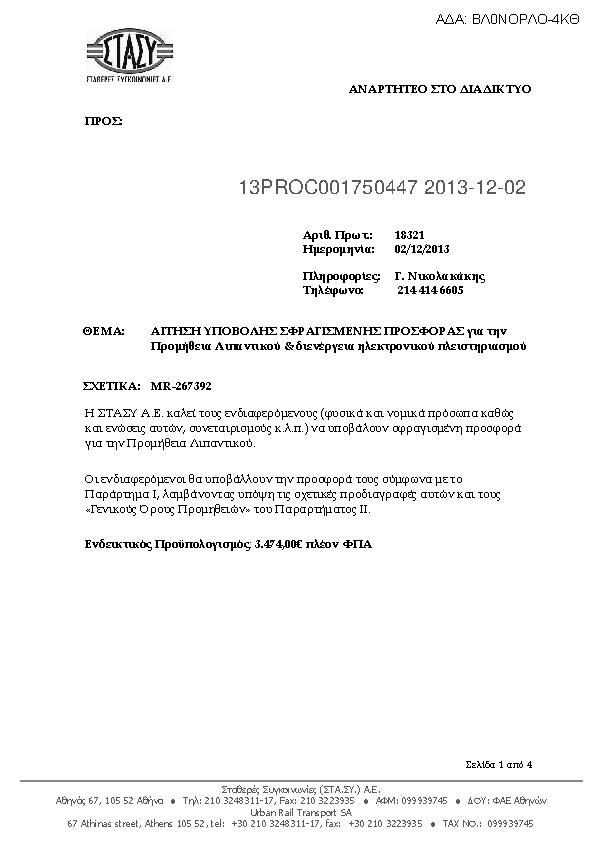 3. ΑΙΤΗΣΗ ΥΠΟΒΟΛΗΣ ΣΦΡΑΓΙΣΜΕΝΗΣ ΠΡΟΣΦΟΡΑΣ για την Επισκευή και Πιστοποίηση συμπλεκτών μηχανισμού αλλαγής γραμμής & διενέργεια ηλεκτρονικής δημοπρασίας