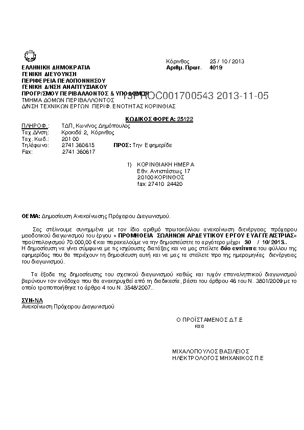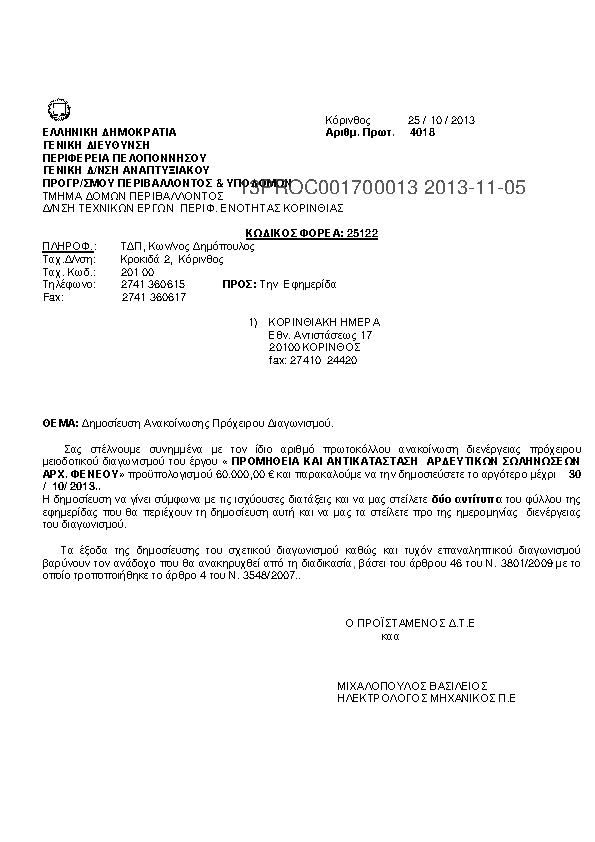 7. ΔΗΜΟΣΙΕΥΣΗ ΑΝΑΚΟΙΝΩΣΗΣ ΠΡΟΧΕΙΡΟΥ ΔΙΑΓΩΝΙΣΜΟΥ ΤΟΥ ΕΡΓΟΥ ''ΠΡΟΜΗΘΕΙΑ ΚΑΙ ΑΝΤΙΚΑΤΑΣΤΑΣΗ ΑΡΔΕΥΤΙΚΩΝ ΣΩΛΗΝΩΣΕΩΝ ΑΡΧ. ΦΕΝΕΟΥ''
