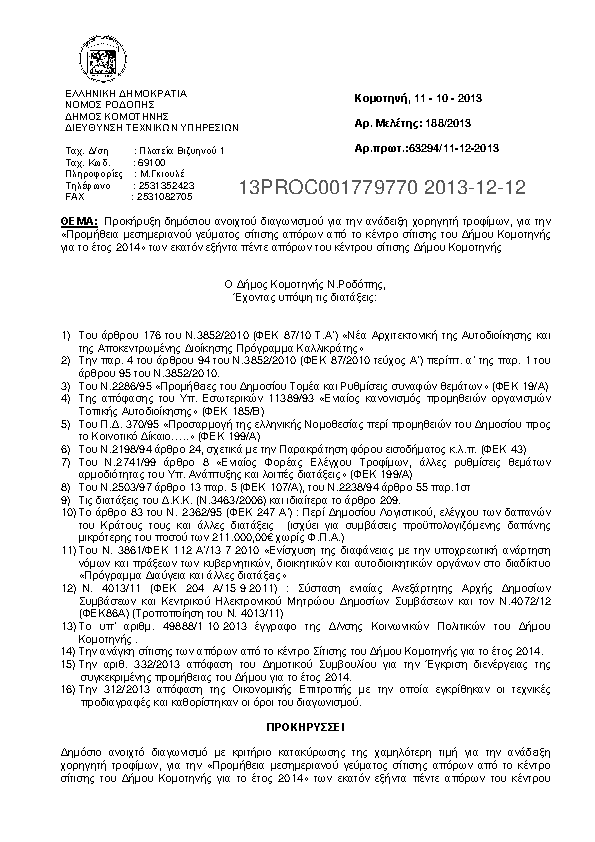 3. Προμήθεια μεσημεριανού γεύματος σίτισης απόρων από το κέντρο σίτισης του Δήμου Κομοτηνής για το έτος