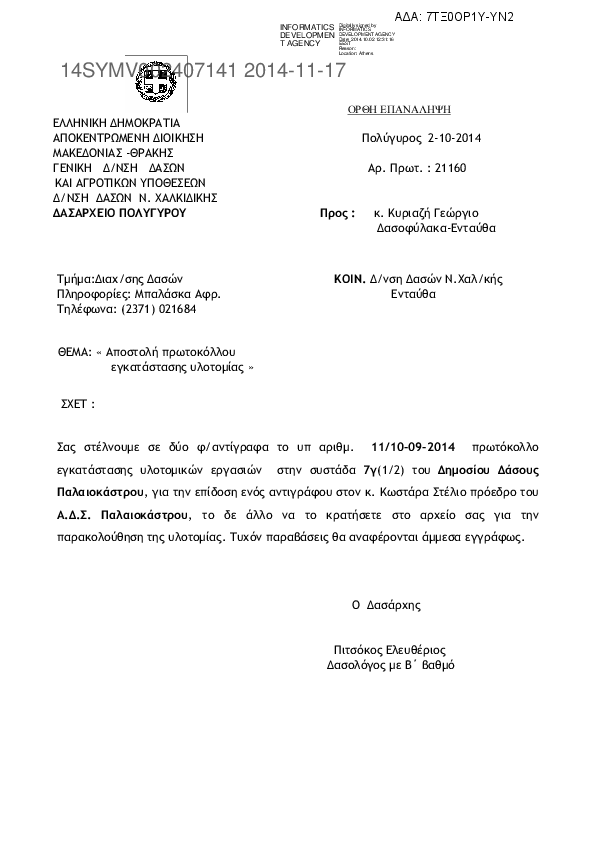 3. ΣΥΜΦΩΝΗΤΙΚΟ ΚΑΙ ΠΡΩΤΟΚΟΛΛΟ ΕΓΚΑΤΑΣΤΑΣΗΣ ΣΥΣΤΑΔΑΣ 7γ(1/2) ΠΑΛΑΙΟΚΑΣΤΡΟΥ